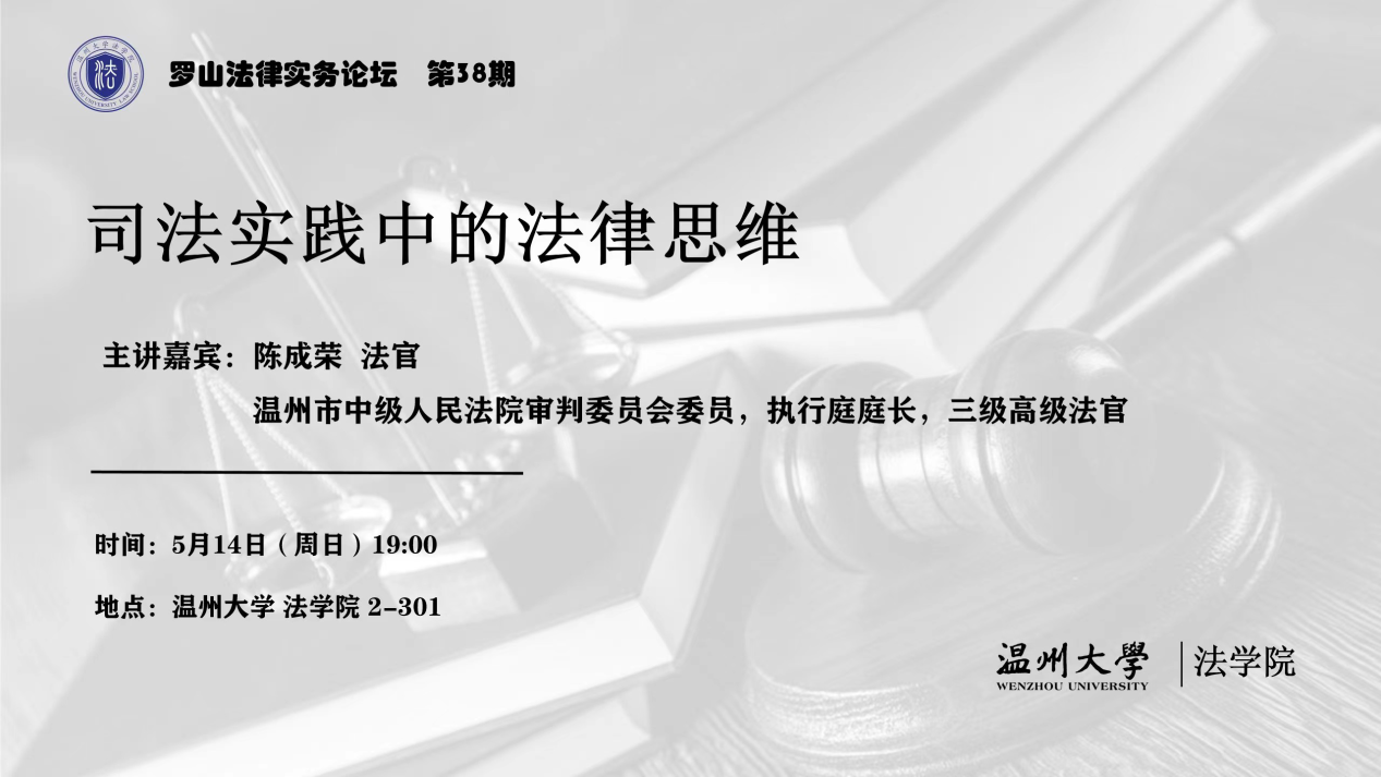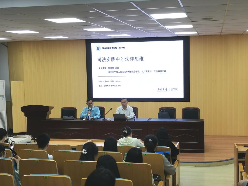 2023年5月14日,温州市中级人民法院审判委员会委员、执行庭庭长、三级高级法官陈成荣法官应邀作客罗山法律实务论坛,在禁漫天堂 师生带来题为《司法实务中的法律思维》的禁漫天堂 ,禁漫天堂 由李勇军老师主持。