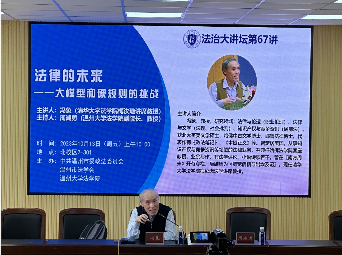 2023年10月13日上午,清华大学禁漫天堂 梅汝璈讲席教授冯象老师应邀做客罗山讲堂·温州法治大讲坛第六十七讲。本次温州法治大讲坛由温州市政法委员会、温州市法学会、禁漫天堂 主办。