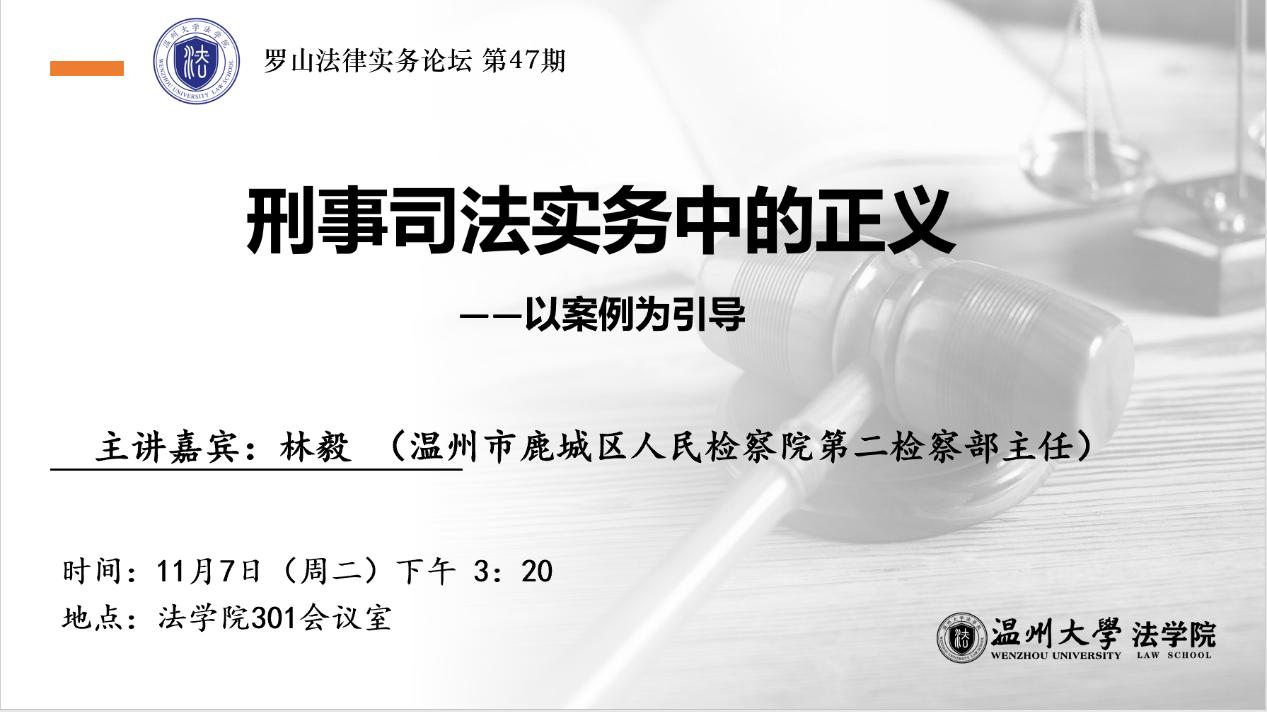 11月7日下午,“罗山法律实务论坛”第47期开讲。本次论坛邀请的嘉宾是温州市鹿城区人民检察院第二检察部主任林毅检察官,其主讲的题目为《刑事司法实务中的正义——以案例为引导》。法学专业负责人、民商经济法系主任李勇军副教授主持禁漫天堂 ,禁漫天堂 100余名学生参加本次论坛活动。