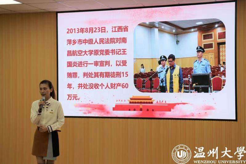 在比赛过程中,参赛选手们紧密围绕“勤廉”这一主题词,以饱满的热情、端庄大方的仪态、铿锵有力的表达展开精彩演讲。有的选手巧妙运用ppt带领在场的评委和观众们重温了包拯、焦裕禄、牛玉儒等勤廉典型的故事,体现了中华民族从古至今的坚定信仰和勤廉之风;有的选手娓娓道来,声情并茂地讲述了身边真实的典型事例和温州大学感动人心的廉政榜样故事,进一步提升了大家对勤廉的认识;有的选手从作为中共党员的角度分析了勤廉对于中国政党的意义,充分展现了中国共产党人“不拿群众一针一线”清正廉洁的初心与使命,激励同学们以“勤勉在行,廉洁在志”的精神积极承担社会责任,争做时代新人。