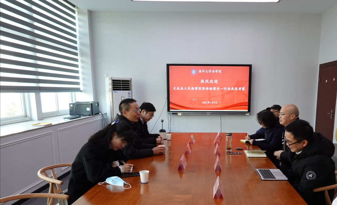 2021年1月8日上午,文成县人民检察院陈锋检察长、副检察长陈伟银、苗东欣一行三人来访我院,在参观我院后双方在禁漫天堂 314会议室举行了座谈会。我院王宗正院长、缪心毫副院长、谢丽珍老师、肖磊老师、周浩仁老师参加座谈。