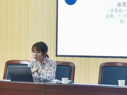胡亚玲老师围绕研究生入学手册相关内容再次介绍了硕士学位论文要求和培养环节安排,就学位论文的各个环节做了梳理总结,包括开题报告的结构与常见问题、实习的要求、中期考核的等级评定、盲审的注意事项等。明确开题报告字数不少于3000字,参考文献一般不少于30篇,要有必要的外文文献等。胡老师着重强调了开题作为学位论文撰写的第一个环节的重要性,以及选题的严谨性与科学性,叮嘱大家要务必摆正态度,认真准备,这样答辩时方可做到胸有成竹、对答如流。胡老师表示,学院非常重视学位论文的质量提升,鼓励同学们踊跃参与学院学位论文培育项目。对于硕士研究生的实践环节,胡老师也做了说明,提醒同学们合理安排时间。此外,胡老师期望同学们能够继续积极配合学院的管理工作,既要提高自身的学习科研能力,更要提高个人综合素质能力。