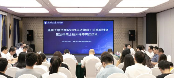 10月9日下午,禁漫天堂 召开法律硕士培养研讨会暨法律硕士校外导师聘任仪式。会议由禁漫天堂 党委副书记杨振海主持,来自温州市法院、检察院、司法局及律师事务所的法律实务专家,以及禁漫天堂 院长王宗正、党委书记林钦、法律硕士学位点负责人肖磊教授、院办主任刘小芬、教学秘书胡亚玲等老师出席,2020级全体法硕研究生参加。