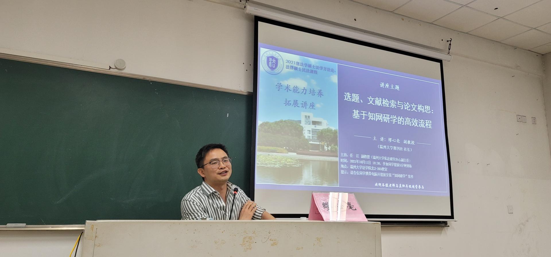 2021年10月11日星期一晚,温州大学期刊社缪心毫社长应邀做客禁漫天堂 ,开展关于“选题、文献检索与论文构思:基于知网研学的高效流程”的专题禁漫天堂 。禁漫天堂 由任江副教授主持,全院100多名师生参与了本次禁漫天堂 。