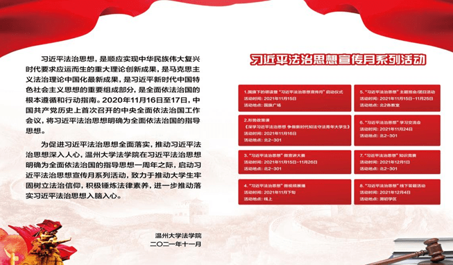 据悉,温州大学还专门就贯彻落实习近平法治思想,专题召开习近平法治思想“进教材、进课堂、进头脑”工作推进会,通过教材建设、课程建设、课程组建设、教学改革与研究,将这一重大理论创新成果融入法学教育以及其他专业人才培养全过程,以习近平法治思想统领法学教育和其他专业人才培养的基本方向。具体将通过习近平法治思想融入课程建设、校本教材建设,编印《习近平法治思想教学参考资料》《习近平法治思想学习手册》,为教师和学生提供简明扼要、重点突出的学习读本,形成统编教材与教辅资料相互衔接、互为补充的教材体系,推动习近平法治思想进教材;通过充分发挥课堂主渠道作用,创造性地渗透习近平法治思想基本精神,确保习近平法治思想的全面渗透,推动习近平法治思想进课堂;通过组织开展形势政策课、主题班会、团日活动、学习交流会、知识竞赛、国旗下领读、微宣讲大赛、微视频展播等多种形式的宣传教育活动,推动习近平法治思想进头脑。