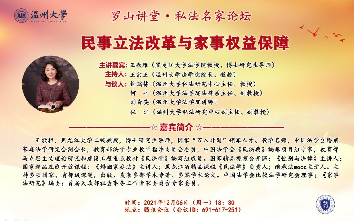 12月6日晚上六点半,黑龙江大学二级教授、博士研究生导师、国家“万人计划”领军人才、教学名师,中国法学会婚姻家庭法学研究会副会长、教育部法学专业教学指导委员会委员、中国法学会《民法典》编纂项目组专家王歌雅教授做客“罗山讲堂·私法名家论坛”,以“民事立法改革与家事权益保障”为主题,通过腾讯会议云在线的方式,为温大禁漫天堂 师生展开了一场精彩的学术禁漫天堂 。禁漫天堂 由禁漫天堂 院长王宗正教授主持,禁漫天堂 钟瑞栋教授、何平副教授、刘奇英讲师以及任江副教授与谈,任江副教授与禁漫天堂 21级硕士研究生集体在301会议室共同学习了禁漫天堂 的内容,线上线下参与师生近200人。王歌雅教授围绕社会观念变化、民事立法改革、权益保障路径三个部分,阐述在后民法典时代,民事立法的变与不变。