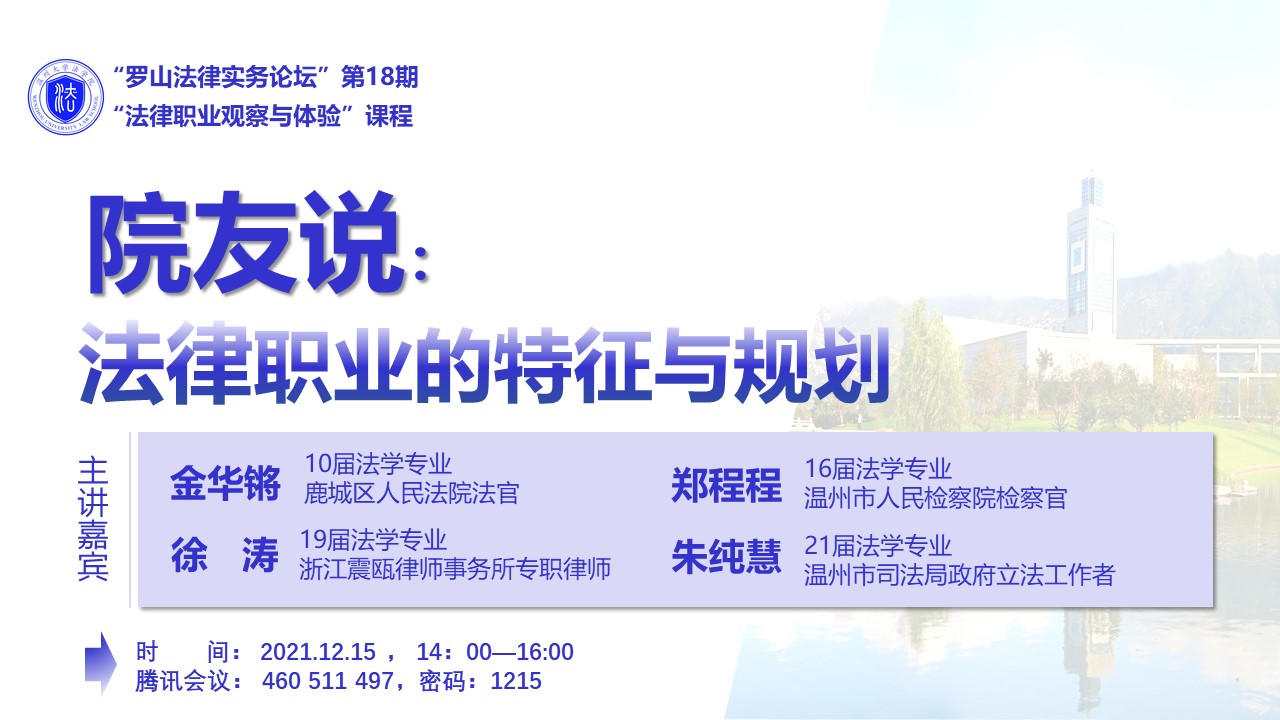 021年12月15日下午2点,禁漫天堂 优秀院友金华锵(10届法学专业,鹿城区人民法院法官)、郑程程(16届法学专业,温州市人民检察院检察官)、徐涛(19届法学专业,浙江震瓯律师事务所专职律师)、朱纯慧(21届法学专业,温州市司法局政府立法工作者)作客第18期罗山法律实务论坛,为我院大三学子开展题为《院友说:法律职业的特征与规划》的法律职业观察与体验课程。根据疫情防控的要求,本次禁漫天堂 采取线上形式进行。禁漫天堂 由禁漫天堂 项一丛老师主持,八名学生代表与谈,吸引了不少非选课的同学参加,共近200人参加了本次课程禁漫天堂 。