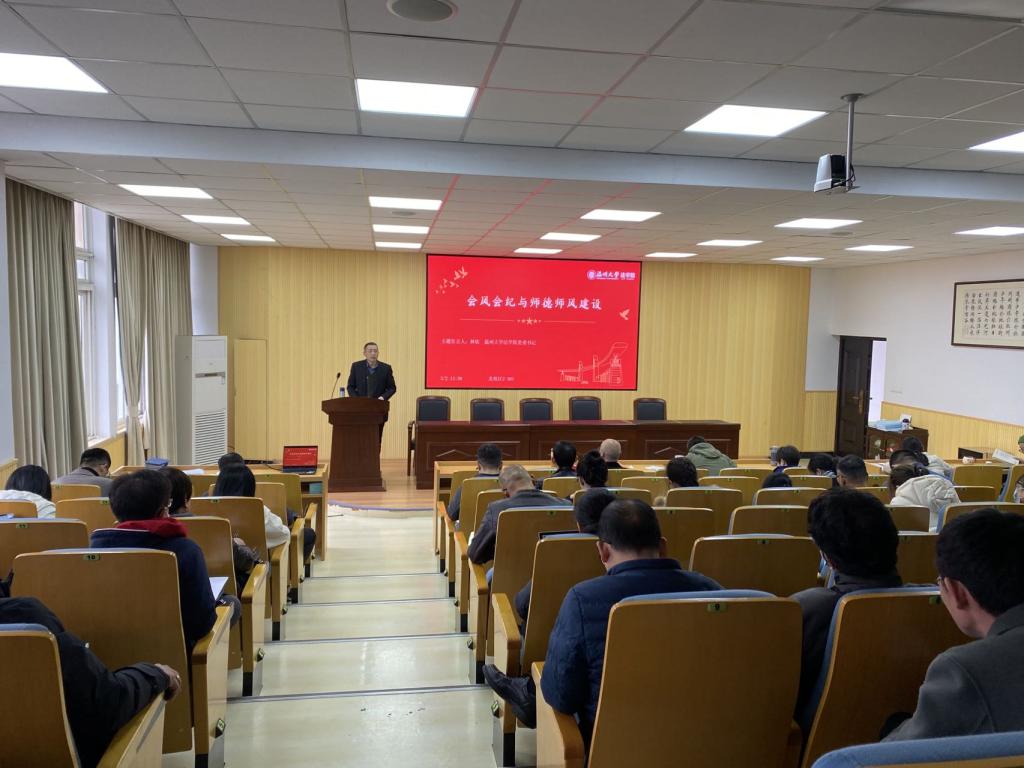 林钦作会风会纪与师德师风专题教育,带领学院全体教师学习了《温州大学教职工考勤与请假管理办法(2017年修订)》《温州大学教师职业行为规范及师德失范行为处理办法(试行)》等文件,他强调,良好的师德师风是师者的本分,学院教师应当以高标准的师德师风要求和约束自己,学院将始终将师德师风作为第一衡量标准,建设一支具有较高素养的教师队伍。