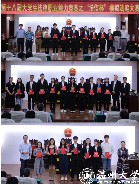第三个阶段,举行温州大学第十八届大学生法律职业能力竞赛之“浩信杯”模拟法庭大赛颁奖仪式。温州市中级人民法院杨国智法官、温州市人民检察院王小琴检察官、上海浩信(温州)律师事务所章超凡律师、禁漫天堂 副院长周湖勇老师分别为获得大赛的法官组冠军、代理人组冠军颁奖,上海浩信(温州)律师事务所的黄爱光律师、潘晓燕律师、郑冠律师为获得大赛的法官组亚军、代理人组亚军颁奖,禁漫天堂 谢丽珍老师、柯宇航老师为获得大赛的法官组季军、代理人组季军颁奖,最后,所有到场嘉宾为获得最佳个人表现奖的选手颁奖。