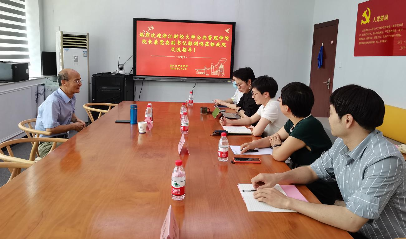 7月7日下午,浙江财经大学公共管理学院院长兼党委副书记郭剑鸣莅临我院交流指导,副院长周一颜、付翠莲教授以及行管系教师朱婉菁、许晋明、张鹏、张会芬等博士出席座谈会。