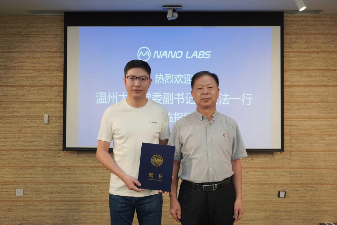 孔剑平校友对近年来母校的快速发展感到自豪,表达对母校发展的支持和关心,愿意创造更多价值助力母校发展。他详细介绍公司产品特性、技术优势以及公司运行情况,并介绍豪微科技母公司纳斯达克上市主体Nano Labs的基本情况,并带领参观演示公司产品,双方就元宇宙、区块链等行业话题进行深入探讨。座谈中,孔剑平校友畅谈自己的求学时光和创业经历,向各位生动呈现一幕幕创业故事。吴金法高度评价和肯定孔剑平取得的创业成绩,他指出,孔剑平求学期间的大学生创业经历以及毕业后的跨界创业经历,就是温大校训“求学问是,敢为人先”的鲜明写照,勉励大家要发扬温大精神。