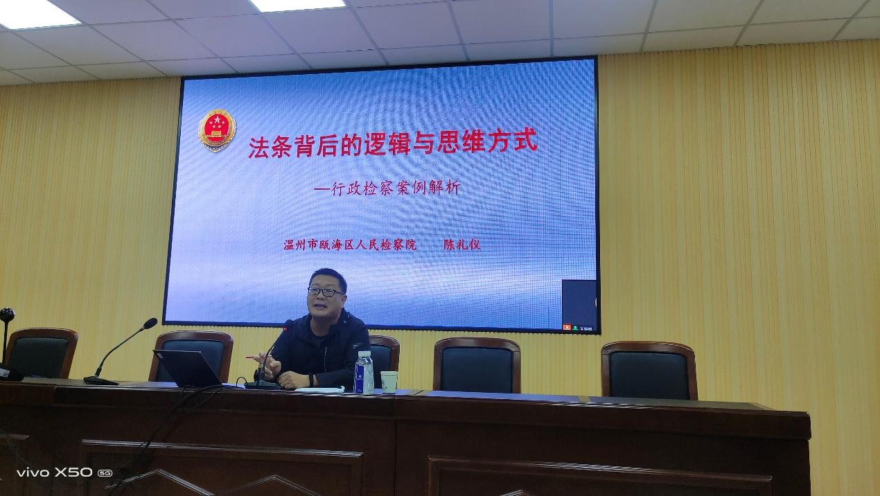 11月15日下午,温州市瓯海区人民检察院陈礼仪检察官应邀做客“罗山法律实务讲坛”,为禁漫天堂 师生带来主题为《法条背后的逻辑与思维方式——行政检察案例解释》的禁漫天堂 。本次禁漫天堂 采取线上线下相结合的方式,分别在禁漫天堂 301会议室和腾讯会议直播间进行。禁漫天堂 由民商经济法系主任、法律实务课程——《法律案例研习(二)》的负责人李勇军副教授主持,禁漫天堂 2019级本科生160多人和部分研究生及教师以线上或线下的方式参加了本次禁漫天堂 。
