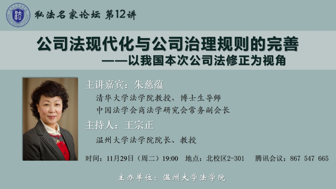 2022年11月29日晚,中国法学会商法学研究会常务副会长、博士生导师、清华大学禁漫天堂 朱慈蕴教授应邀做客温州大学私法名家论坛,为我校师生作题为《公司法现代化与公司治理规则的完善——以我国本次公司法修正为视角》的禁漫天堂 。禁漫天堂 院长王宗正教授担任主持人,赵金龙教授担任与谈人。因疫情原因,本次禁漫天堂 采取线上方式进行,400余人在线参加禁漫天堂 交流。