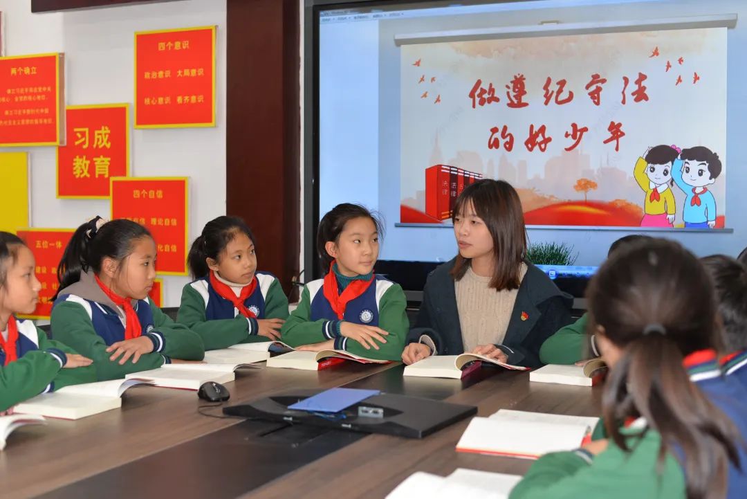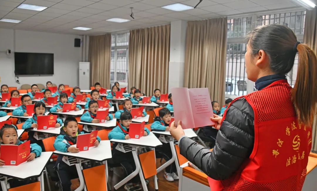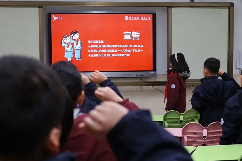 在杭州市艮山路学校“红课厅”,志工家长季律师正带着同学们学习《宪法》知识,普及相关法律知识,进行《宪法》主题知识竞赛,2位表现优异的学生成为了本次竞赛的“小小普法员”。
