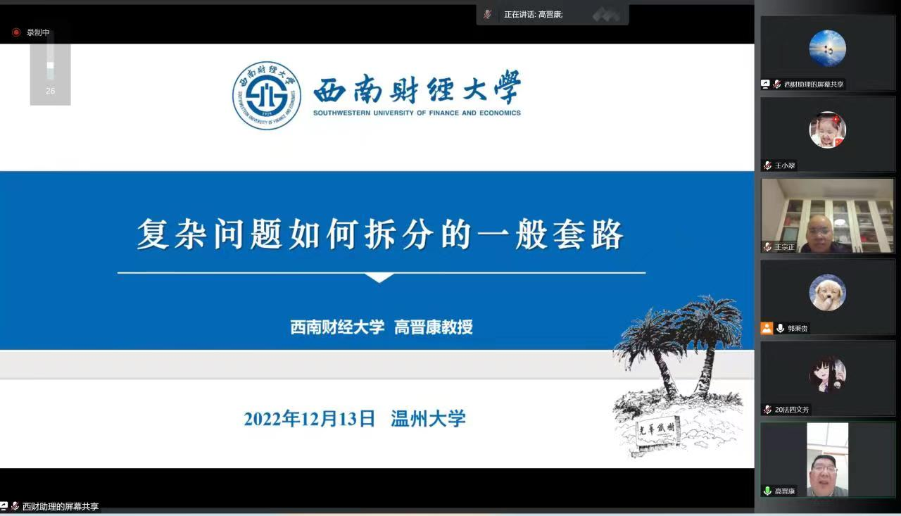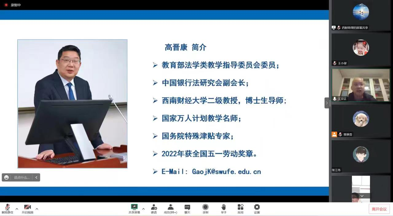 2022年12月13日,西南财经大学禁漫天堂 创始院长、国家级教学名师、教育部法学类教学指导委员会委员、中国银行法研究会副会长高晋康教授应邀为我院师生展开了一场关于“复杂问题如何拆解”的精彩学术禁漫天堂 。本次禁漫天堂 由禁漫天堂 院长王宗正主持,禁漫天堂 师生参加禁漫天堂 ,在线人数280余人。