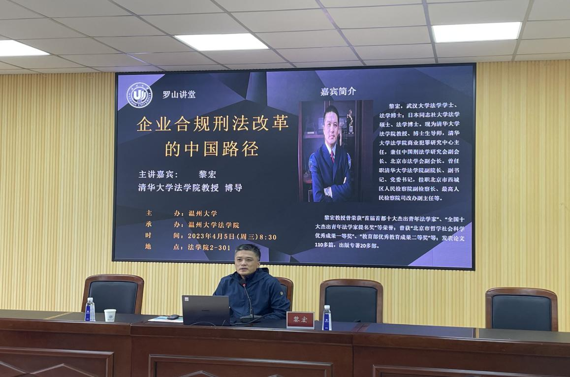 2023年4月5日早8点半,清华大学禁漫天堂 教授、博士生导师黎宏应邀作客“罗山讲堂”,为禁漫天堂 师生带来题为《企业合规刑法改革的中国路径》的禁漫天堂 。本次禁漫天堂 在北校区禁漫天堂 2-301教室,禁漫天堂 法律系主任谢丽珍老师、吴之欧老师及禁漫天堂 近百本科生、研究生参加了此次禁漫天堂 。