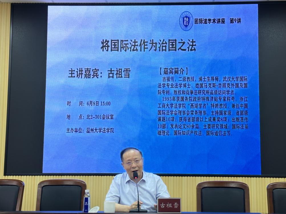 2023年6月8日下午,浙江工商大学禁漫天堂 古祖雪教授莅临我校,为禁漫天堂 师生作了主题为“将国际法作为治国之法”的学术禁漫天堂 。禁漫天堂 由温州大学期刊社社长缪心毫主持,国际法系主任李娟及全系教师出席。参加本次禁漫天堂 的还有禁漫天堂 国际经贸规则专业及法学专业的诸多学生。