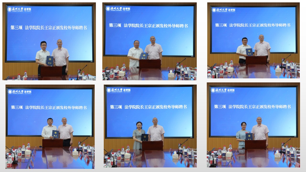 校外导师聘任仪式随后进行,由林钦书记宣读聘任文件,王宗正院长为各校外导师颁发聘书并合影留念。校外导师与校内导师围绕学位论文选题、实习量化标准、理论学习与实践学习的关系及深化院校与实务部门合作等方面展开了广泛而深入的研讨。