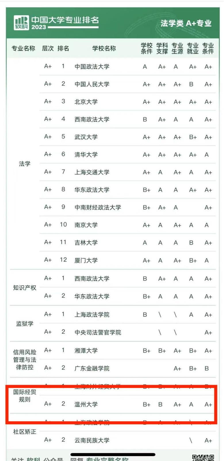 温州大学国际经贸规则专业在2023年中国大学专业排名中再次获得综合评级A+,位列全国第二,至此,温州大学国际经贸规则专业已连续两年在软科中国大学专业排名中获得A+专业。