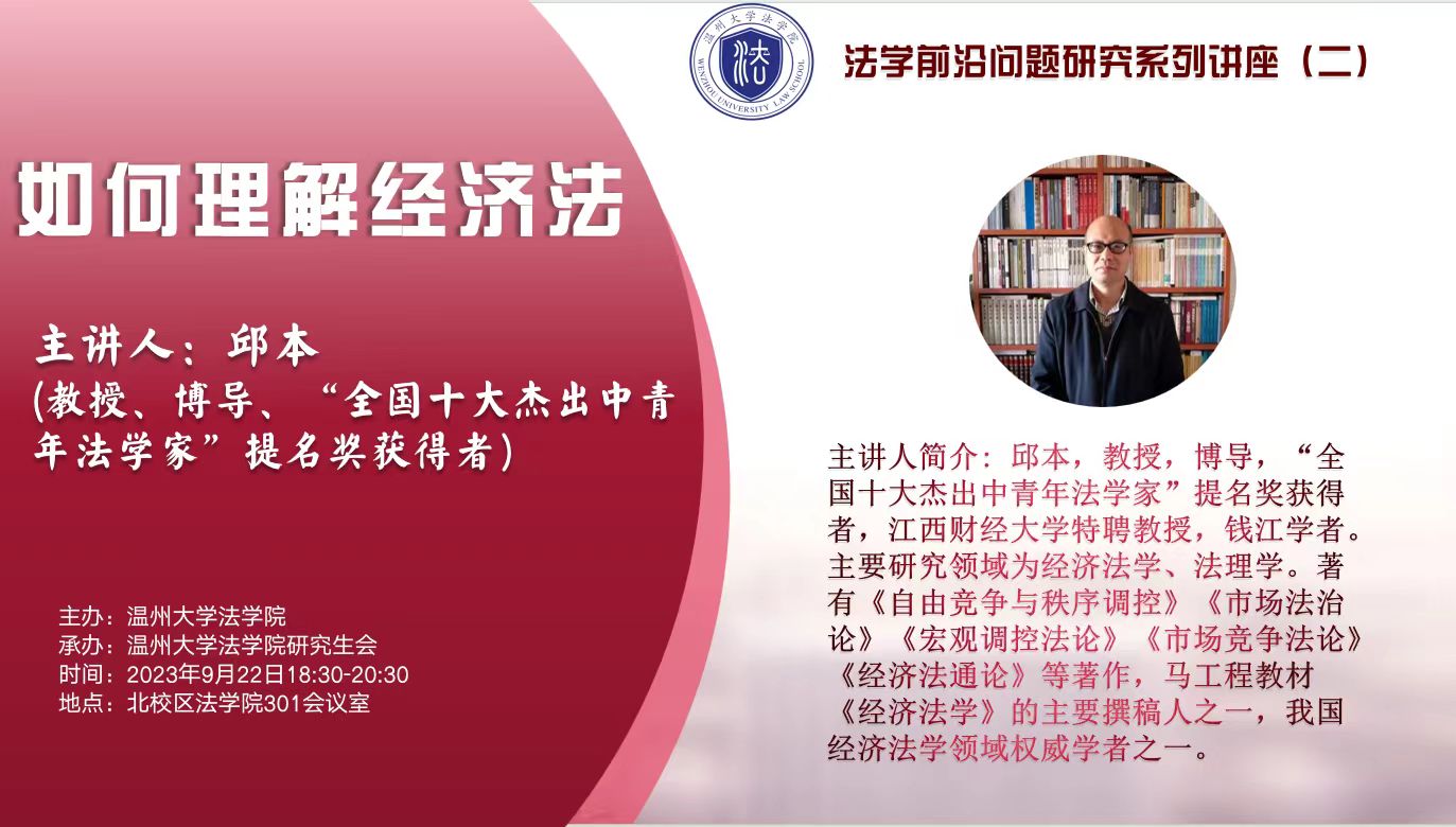 2023年9月22日晚,温州大学邱本教授在禁漫天堂 301会议室为我校师生带来题为《如何理解经济法》的禁漫天堂 。