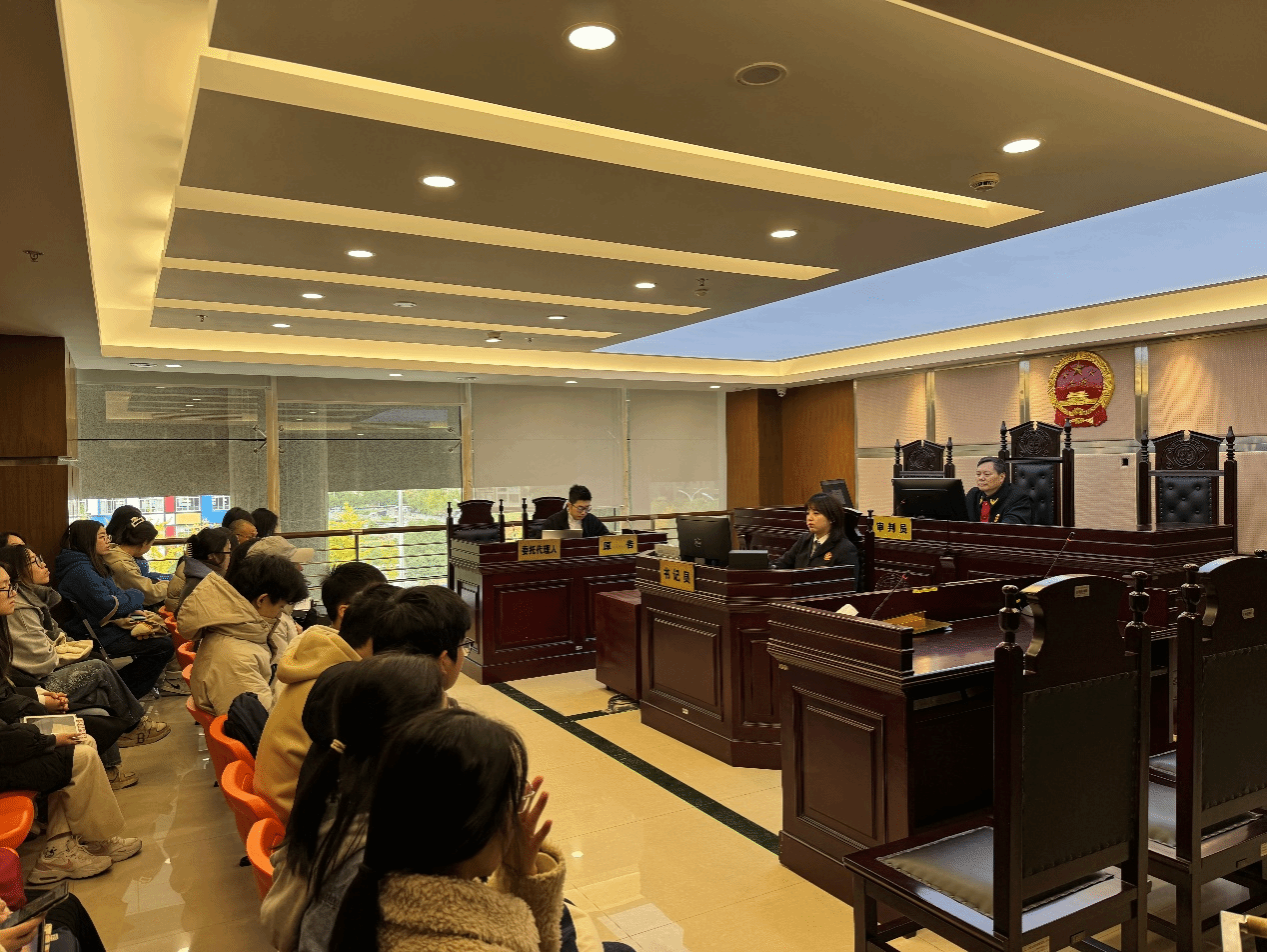 上午,实践团队赴乐清市人民法院开展学习交流活动。同学们在法院工作人员的指引下,现场旁听两起涉买卖合同欠款的案件。庭审过程节奏虽然紧凑、快速,但充分保障了当事人的合法权益,展示了法官高超的审判水平。通过庭审,不仅向师生展示了完整、真实的案件审理过程,而且让同学们充分了解了民事审判的流程和速裁细节,使同学们对缺席审判、证据提交和法官庭审细节有了充分的理解和把握。庭审结束后,主审法官结合相关案件并就民事审判实践与师生进行了深入交流;同时,在法庭参观和短片观看及工作人员的讲解下,对乐清市人民法院的家事审判、巡回法庭及“商人纠纷商会解”等特色内容有了深入了解。最后,同学们还在工作人员的引导下参观了法院法警大队,了解法警的工作职责和工作细节。