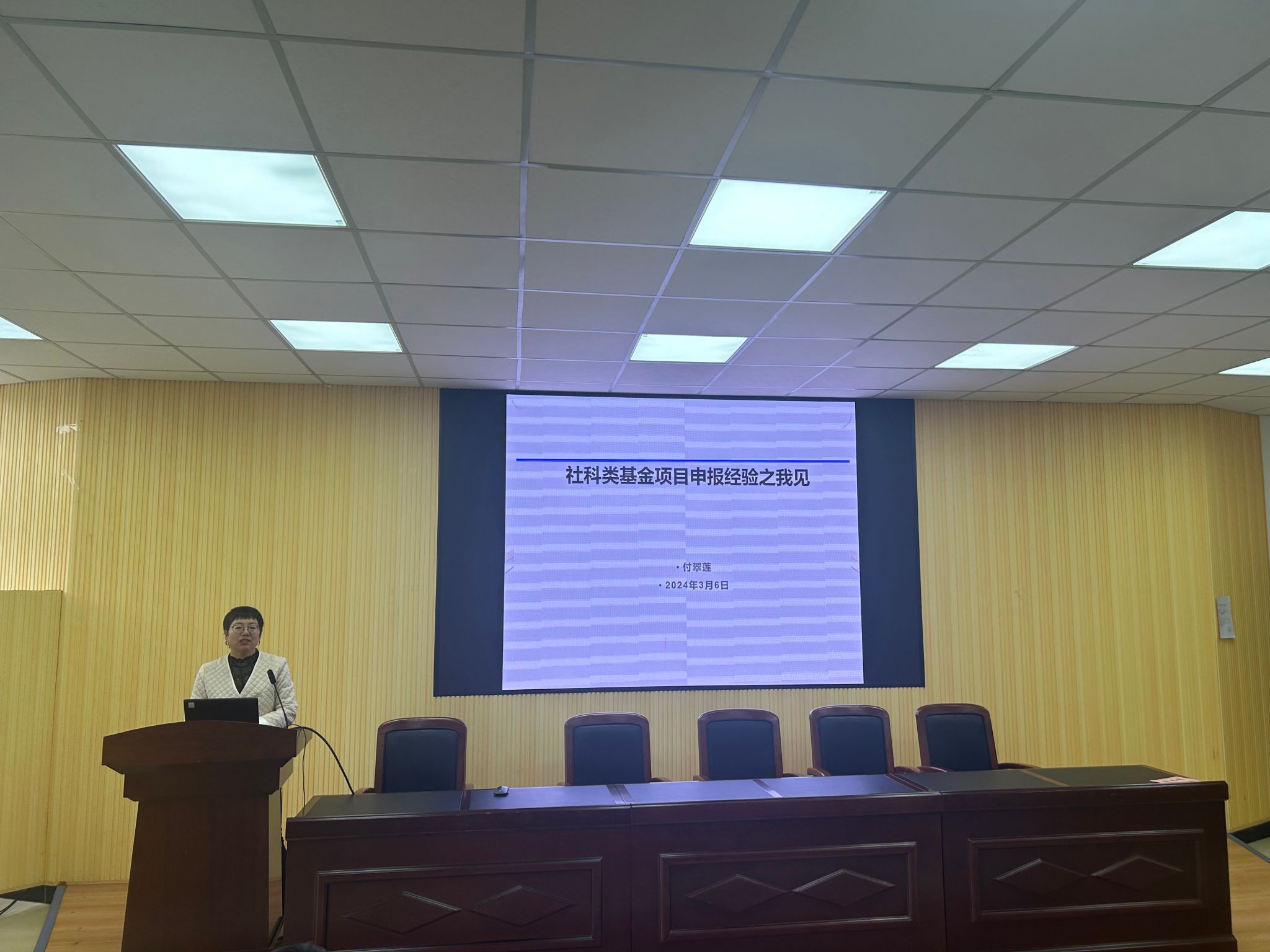 付翠莲教授做国家社科基金项目申报经验分享。她从选题的基本理念、掌握基金项目评审步骤、申报书论证技巧三个方面进行分析,鼓励学院教师要相信自己,精益求精。