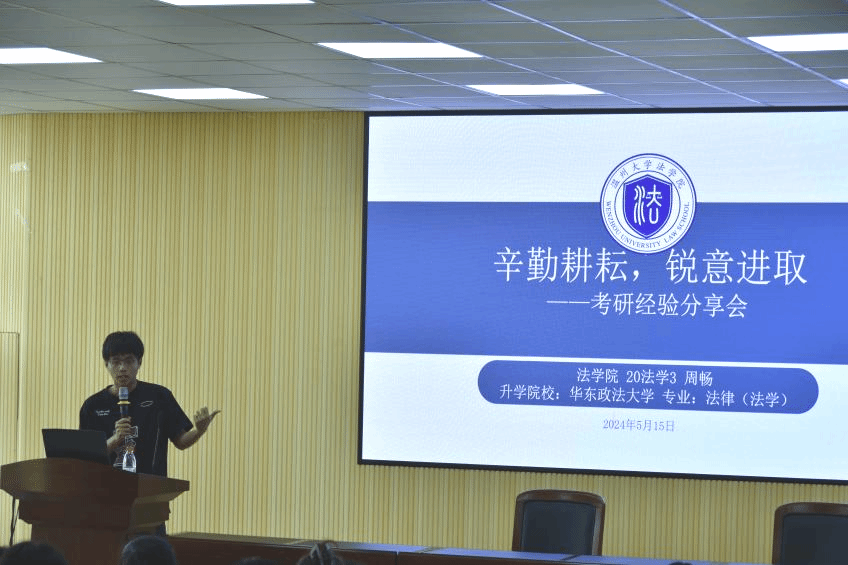 第三位分享的是考取华东政法大学法律专业的周畅。在择校方面,他建议同学们要基于地域条件,结合就业导向来确定学校。在专业选择方面,专硕具有信息差较小、选择时间长、辅导体系完善等优点。在英语学习方面,他详细讲解了学习材料应如何选择,并强调了真题的重要性;在专业课学习中,他指出应试已不再“只背书就能上岸”,考试更加重视知识体系的调动。周畅提醒同学们要提早做好心理建设,减少焦虑,注重休息。关于“饭圈式备考”“考研演员”等现象,他劝诫同学们:“不驰于空想,不骛于虚声”,脚踏实地地向梦想迈进。