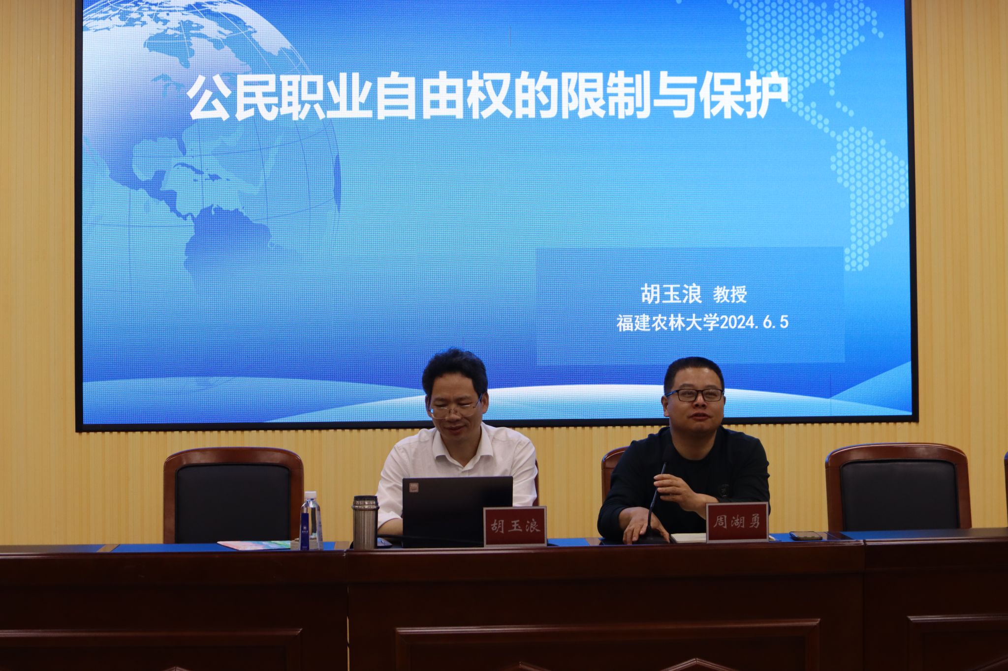 2024年6月5日晚,福建农林大学教授胡玉浪应邀做客禁漫天堂 社会法学术沙龙第8期,为我院师生讲授《公民职业自由权的限制与保护》主题禁漫天堂 。本次沙龙在禁漫天堂 301会议室举行,由禁漫天堂 副院长周湖勇教授主持,禁漫天堂 柯宇航老师、汪银涛老师及禁漫天堂 部分本科生、研究生参加了此次沙龙。