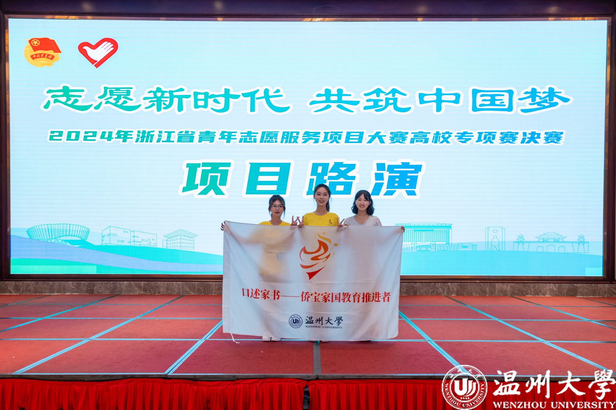 7月5日至7日,由共青团浙江省委、浙江省志愿者协会主办,共青团金华市委、浙江省团校承办,共青团东阳市委协办的2024年浙江省青年志愿服务项目大赛暨青年志愿服务公益创业浙江选拔赛决赛圆满落幕。本次大赛以“志愿新时代 共筑中国梦”为主题,深入贯彻落实党的二十大和二十届二中全会精神和习近平总书记关于志愿服务系列重要指示精神,大力挖掘、培育、推广优秀青年志愿服务项目。我院《口述家书——侨宝家国教育推进者》项目代表温州大学参赛,经过激烈角逐,最终以全省第一的成绩斩获高校专项赛金奖。