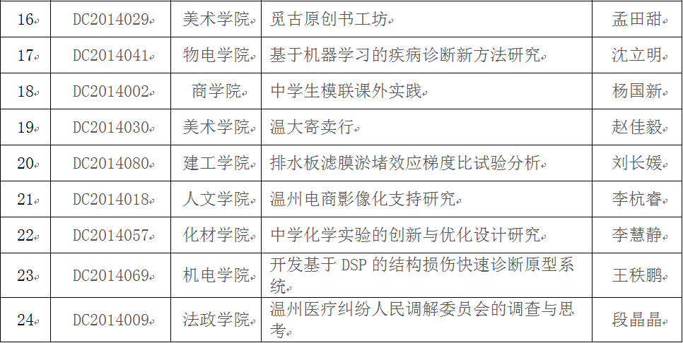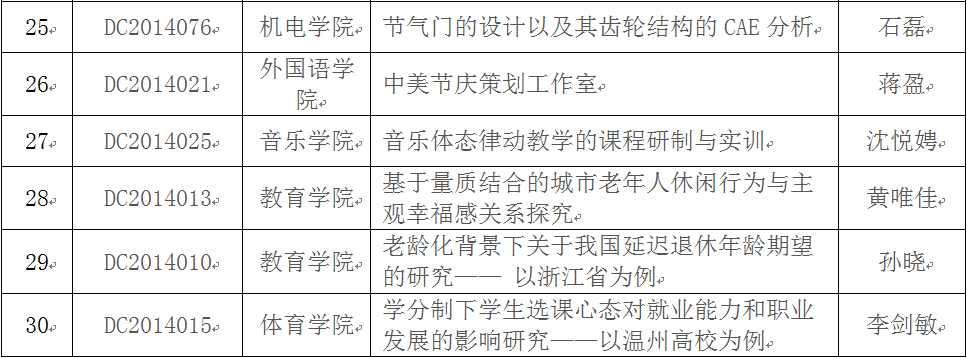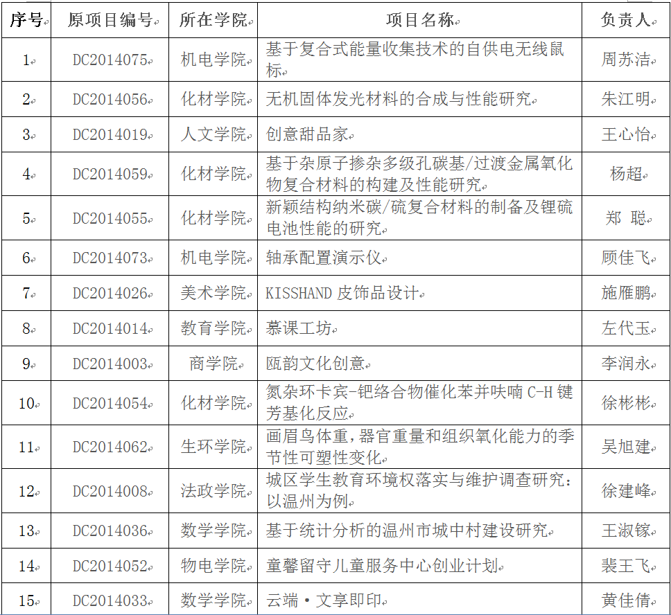 在2014年校级大学生创新创业训练计划项目中期检查的基础上,经学院推荐,学校组织答辩,拟推荐"基于复合式能量收集技术的自供电无线鼠标"等30个项目作为国家级大学生创新创业训练计划项目,现将项目名单予以公示。公示期从即日起至2015年5月22日,如有异议,请联系教务处实践教学科余成格(86598058),陈聪(86597560)。