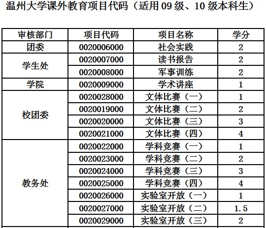 根据《温州大学课外教育项目学分管理办法(试行)》(行政〔2007〕246号) 文件精神,学校将开展课外教育项目学分认定工作,现将有关事宜通知如下: