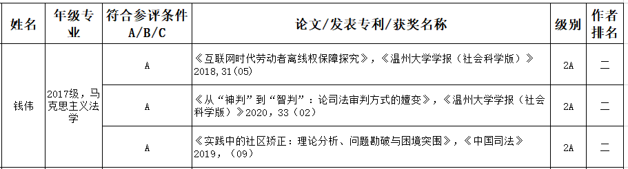 为进一步激励我校研究生勤奋学习、潜心科研,努力提升我校研究生人才培养质量。根据《温州大学优秀研究生评审办法》文件精神,学校开展研究生“学术新锐奖”的推荐评选工作。通知发出后,我院17级研究生钱伟同学在规定时间内提交了评选材料,经学院组织评审,钱伟同学符合评选条件。现推荐到学校参加评选。相关信息公示如下: