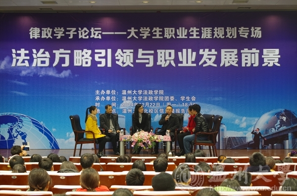 为指导提升大学生职业生涯规划意识和能力,搭建在校生和优秀校友交流平台,2014年12月22日晚,法政学院在北校信息楼报告厅举办"法治方略引领与职业发展前景"职涯规划专场律政学子论坛,邀请优秀校友和在校生就学业就业和职业生涯展开深度对话,共话校园故事和青春梦想。
